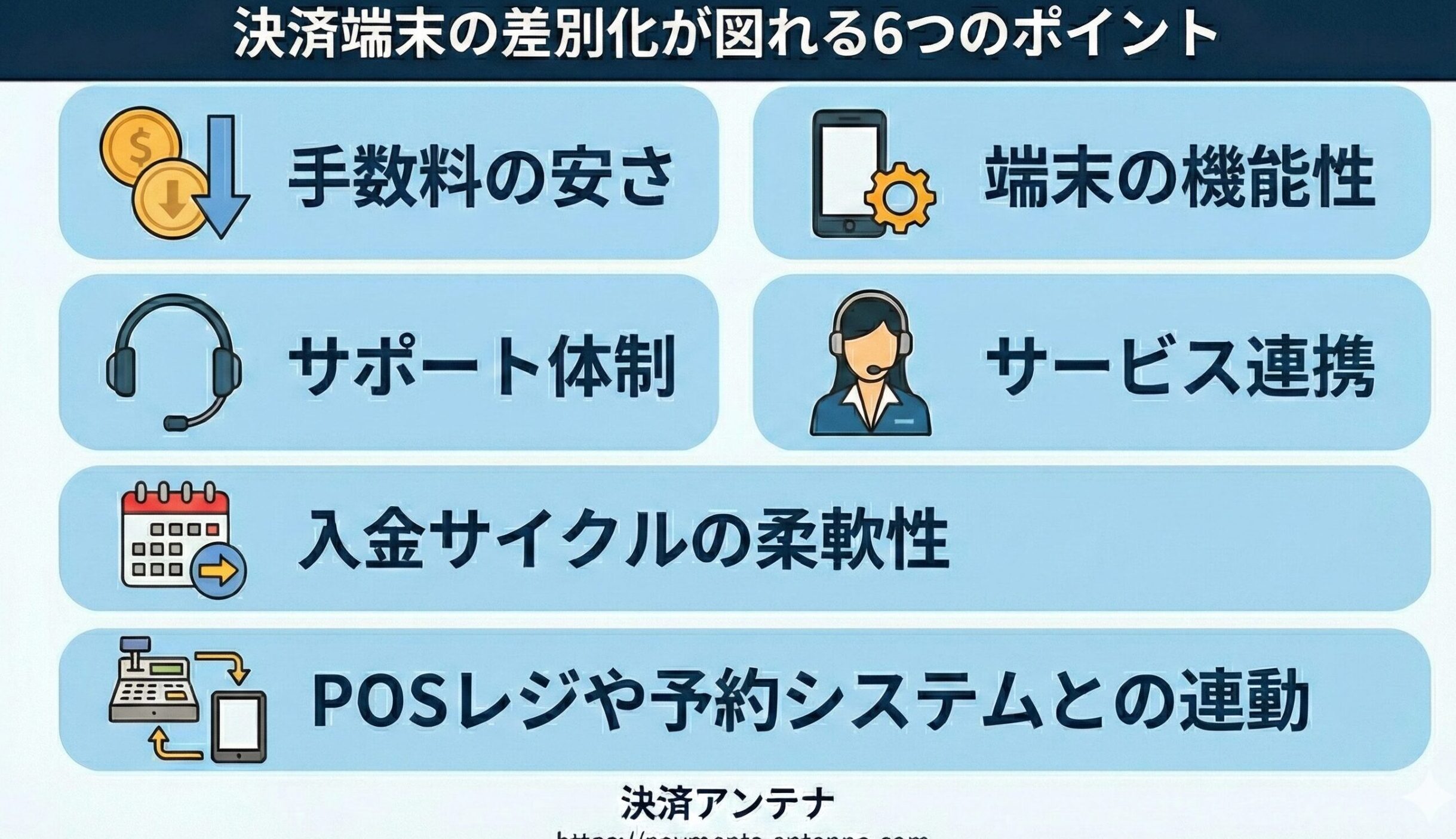 決済端末各社が他社と差別化するために強みとして打ち出しているポイントが以下となっています。