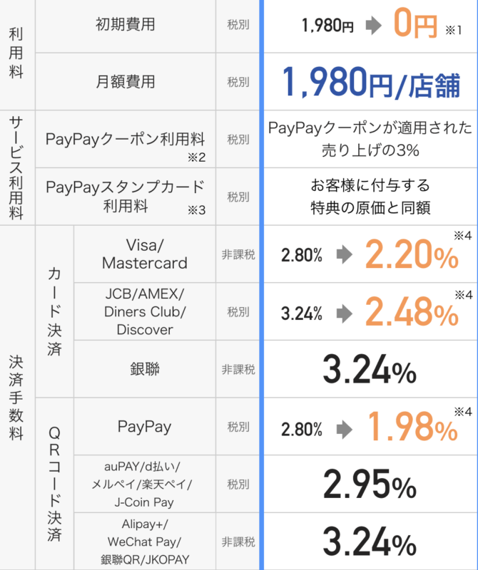 月額1,980円の固定費は必要になりますが、クレジットカードは2.2%、PayPayは1.98%という低い料率でご利用いただけます。
